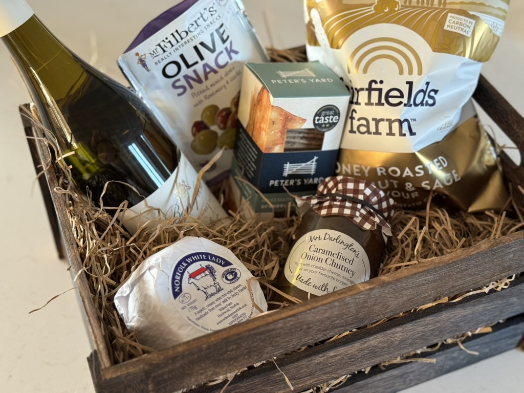 Enjoy a taste of Norfolk with our Deli Hamper, featuring a hand-picked selection of local and artisan produce. Includes artisan cheese, crackers, chutney, olives, and a bottle of Norfolk wine — perfect for a relaxed evening in, or to enjoy on the deck as the sun sets over the garden.